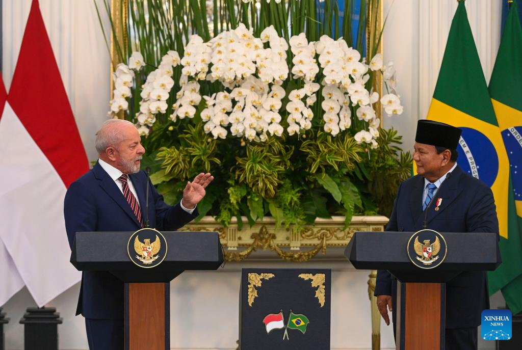 Indonesian President Prabowo Subianto (R) and Brazilian President Luiz Inacio Lula da Silva attend a joint press conference at Merdeka Palace in Jakarta, Indonesia, Oct. 23, 2025. (Photo by Zulkarnain/Xinhua)