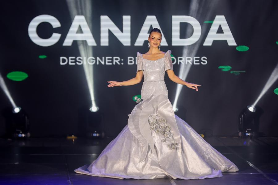 Hailey Wilson of Canada presents a creation during the Miss Earth 2025 Philippine Terno Fashion Show in Quezon City, the Philippines on Oct. 22, 2025. (Xinhua/Rouelle Umali)