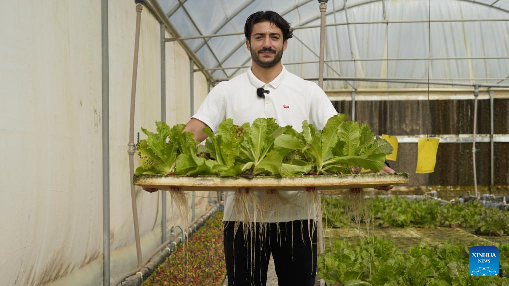 A worker presents vegetables at a hydroponics farm in Tripoli, Libya, Oct. 23, 2025. To alleviate water and arable land shortages, some agricultural technicians in Tripoli have been using hydroponics to cultivate vegetables. (Photo by Hazem Turkia/Xinhua)