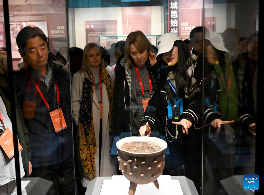 Guests visit the Henan Museum in Zhengzhou, central China's Henan Province, Oct. 23, 2025. The Global Mayors Dialogue and the International Mayor's Forum on Tourism in Zhengzhou kicked off here on Friday. Guests attending the events had visited Henan Museum, Shaolin Temple and other places on Wednesday and Thursday to experience the charm of Henan. (Xinhua/Hao Yuan)