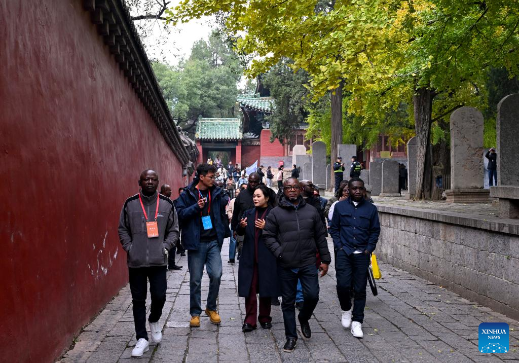 Guests visit Shaolin Temple scenic area in Dengfeng City, central China's Henan Province, Oct. 23, 2025. The Global Mayors Dialogue and the International Mayor's Forum on Tourism in Zhengzhou kicked off here on Friday. Guests attending the events had visited Henan Museum, Shaolin Temple and other places on Wednesday and Thursday to experience the charm of Henan. (Xinhua/Hao Yuan)