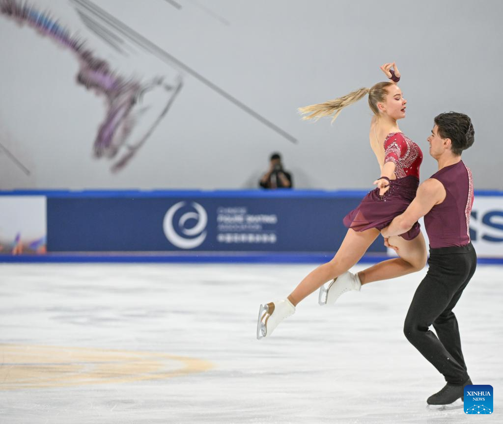 Evgeniia Lopareva (Front)/Geoffrey Brissaud of France perform during the ice dance rhythm dance at the Cup of China ISU Grand Prix of Figure Skating 2025 in southwest China's Chongqing Municipality, Oct. 24, 2025. (Xinhua/Huang Wei)