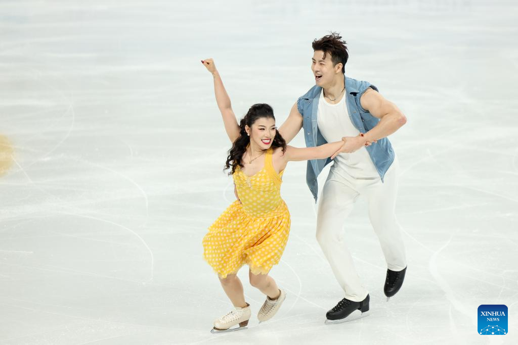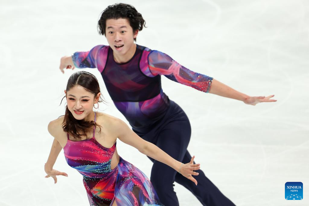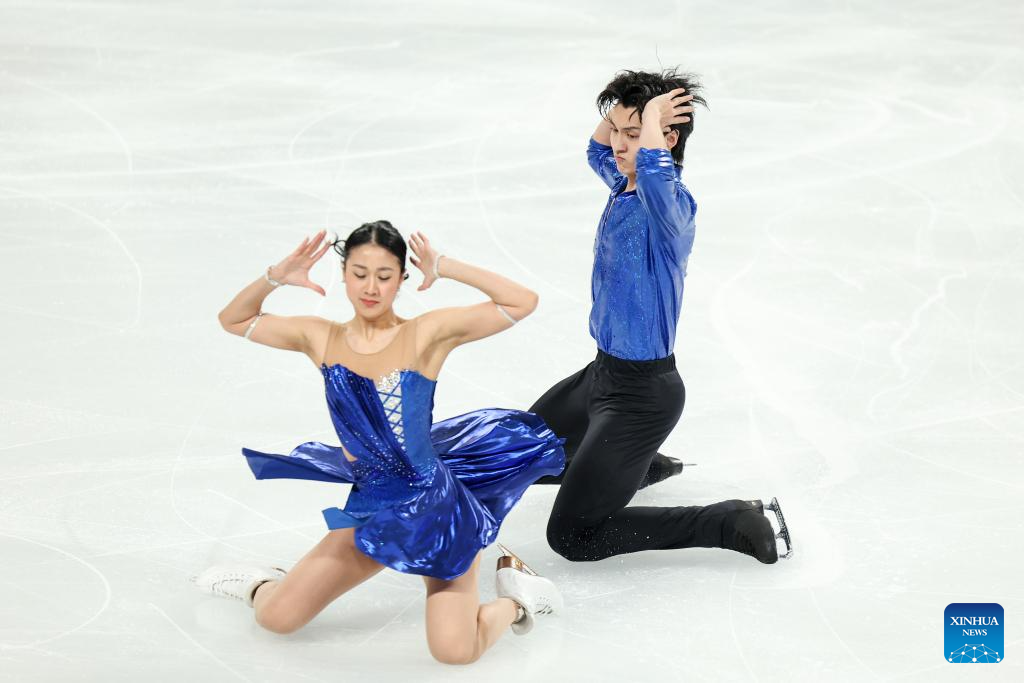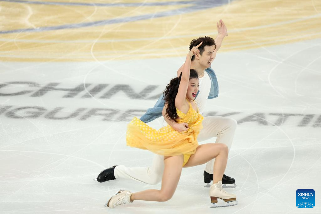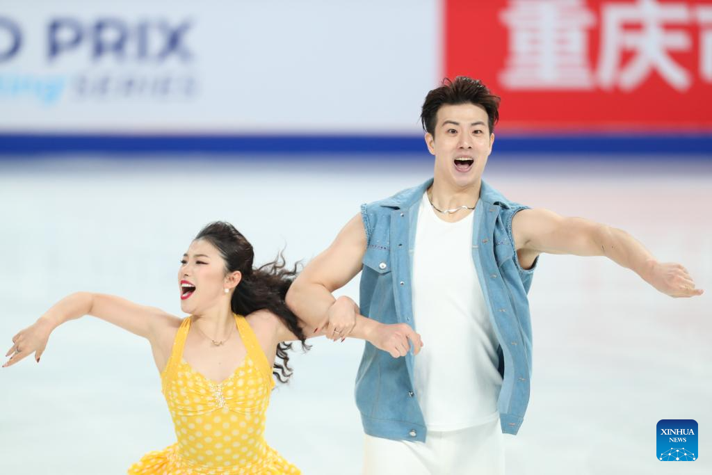 Wang Shiyue (Front)/Liu Xinyu of China perform during the ice dance rhythm dance at the Cup of China ISU Grand Prix of Figure Skating 2025 in southwest China's Chongqing Municipality, Oct. 24, 2025. (Xinhua/Huang Wei)