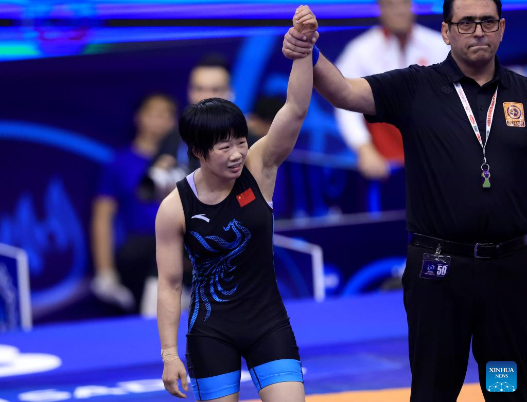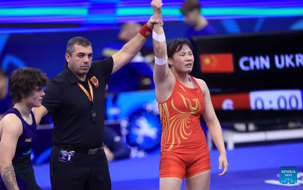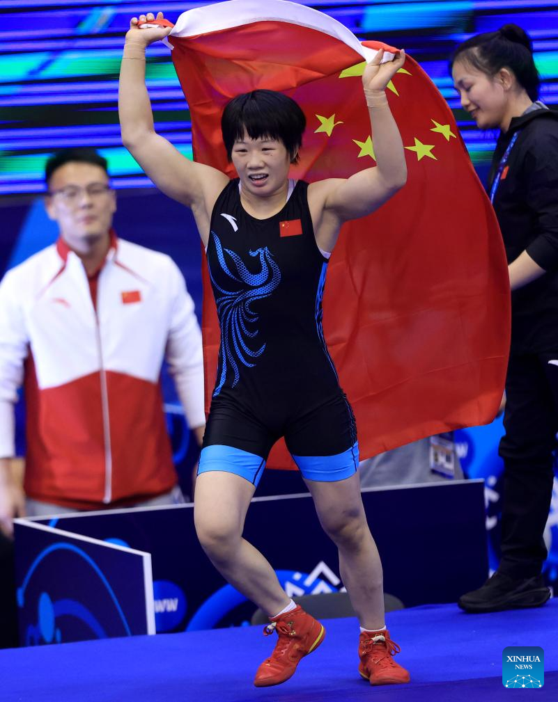 China's Liang Jinyue celebrates victory against Audrey Rae Jimenez of the United States after their final match of the women's 50 kg category at the U23 Wrestling World Championships in Novi Sad, Serbia on Oct. 23, 2025. (Photo by Predrag Milosavljevic/Xinhua)