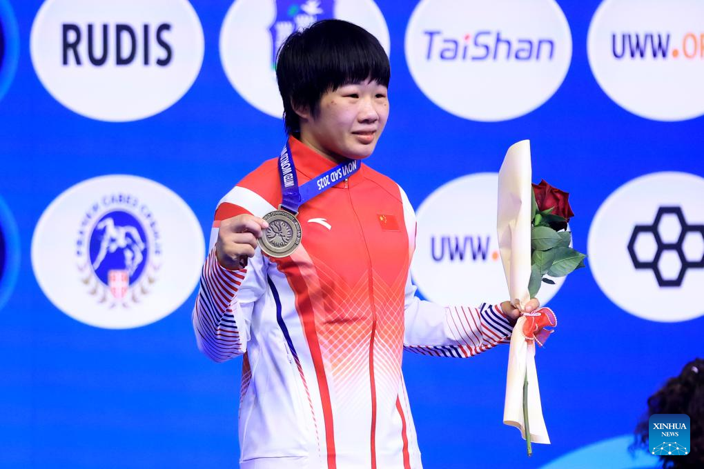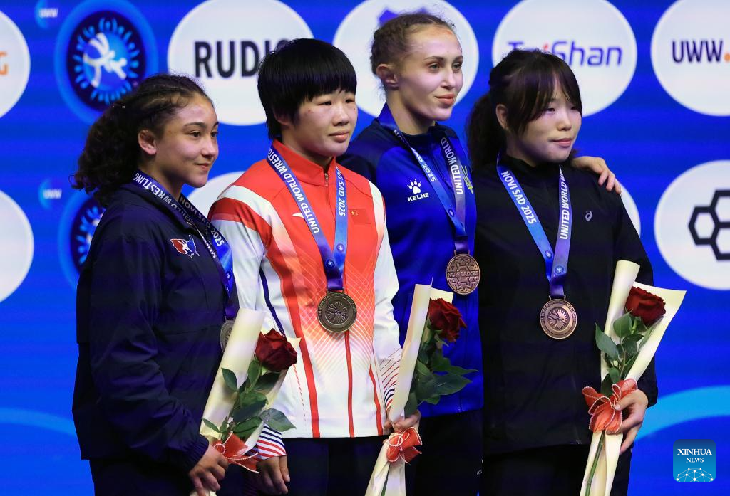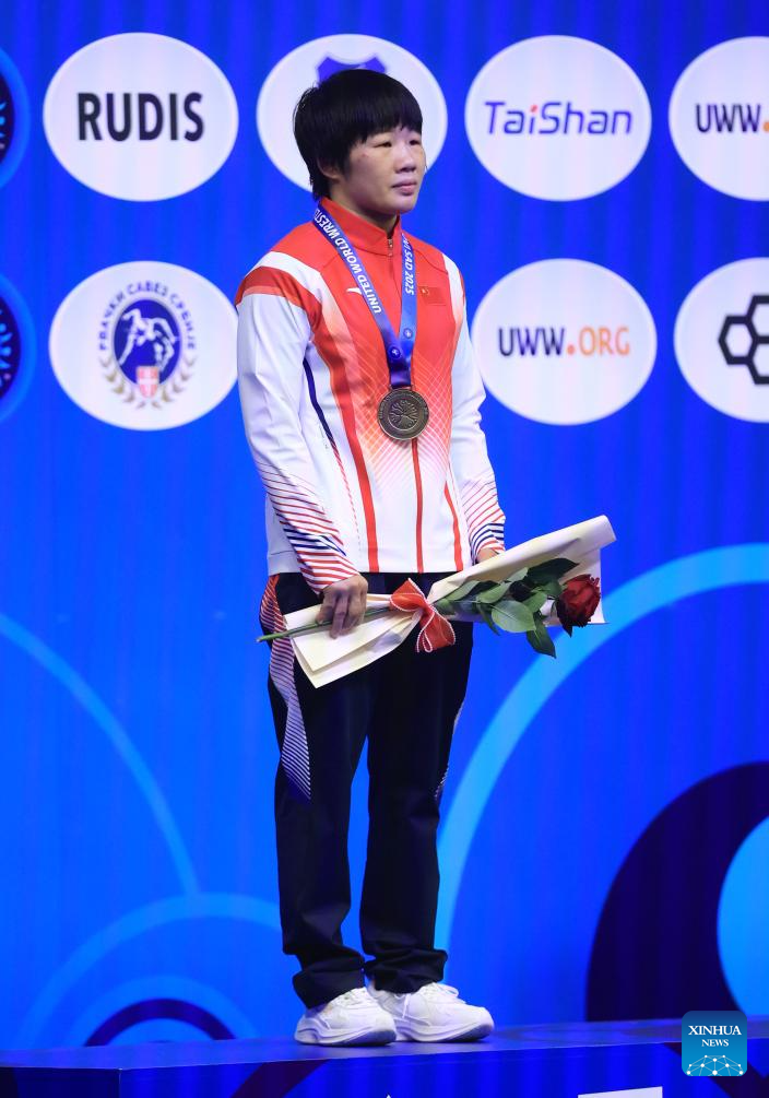 Gold medalist China's Liang Jinyue pose photos during the awarding ceremony for women's 50 kg category at the U23 Wrestling World Championships in Novi Sad, Serbia on Oct. 23, 2025. (Photo by Predrag Milosavljevic/Xinhua)