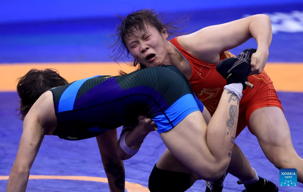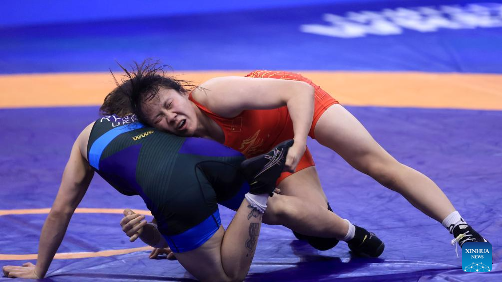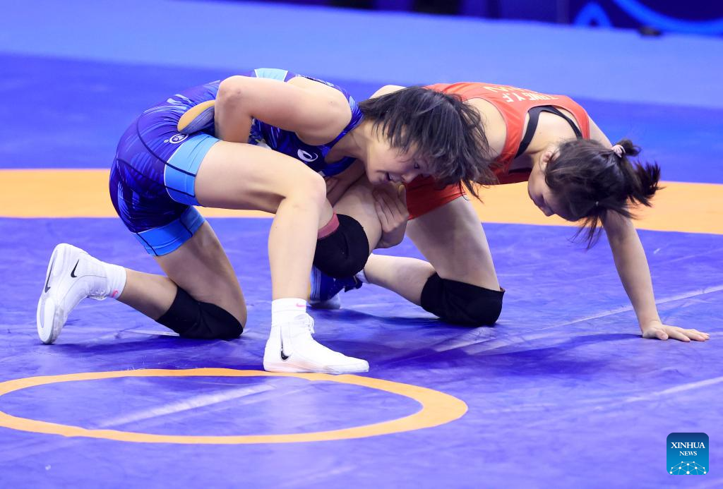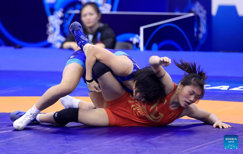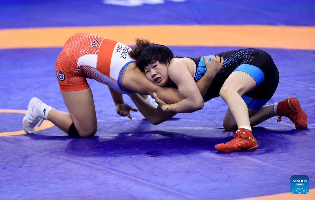 China's Liang Jinyue (up) and Audrey Rae Jimenez of the United States compete during their final match of the women's 50 kg category at the U23 Wrestling World Championships in Novi Sad, Serbia on Oct. 23, 2025. (Photo by Predrag Milosavljevic/Xinhua)