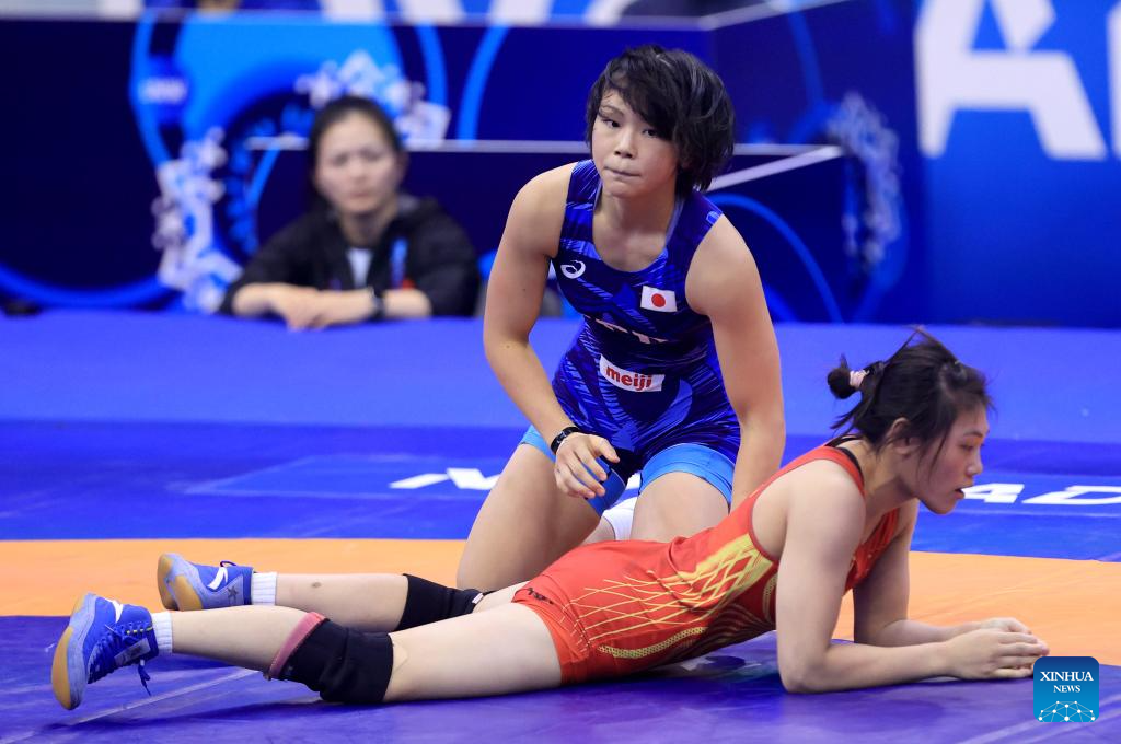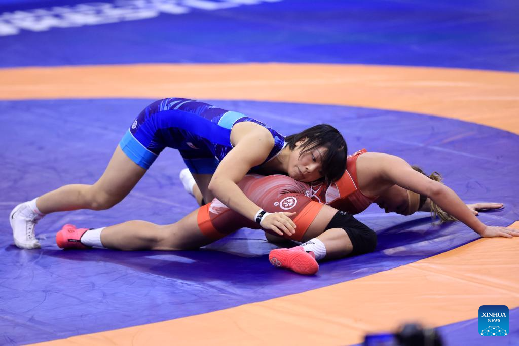 Japan's Akari Fujinami (up) and China's Tang Yifan compete during their 1/8 final match of the women's 57 kg category at the U23 Wrestling World Championships in Novi Sad, Serbia on Oct. 23, 2025. (Photo by Predrag Milosavljevic/Xinhua)