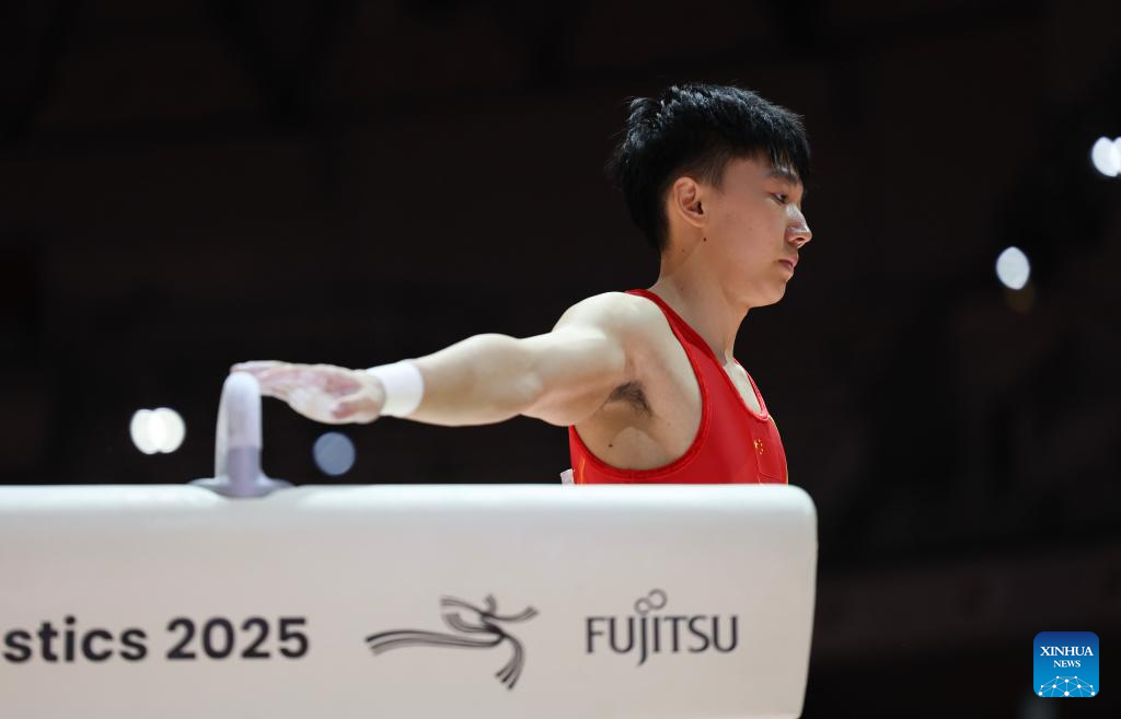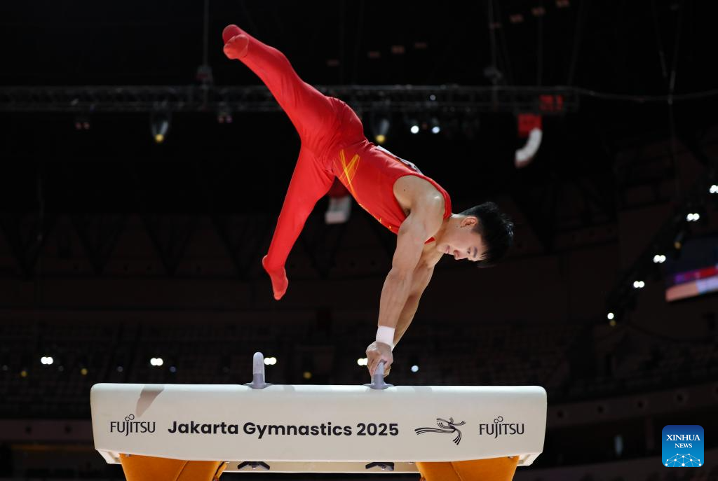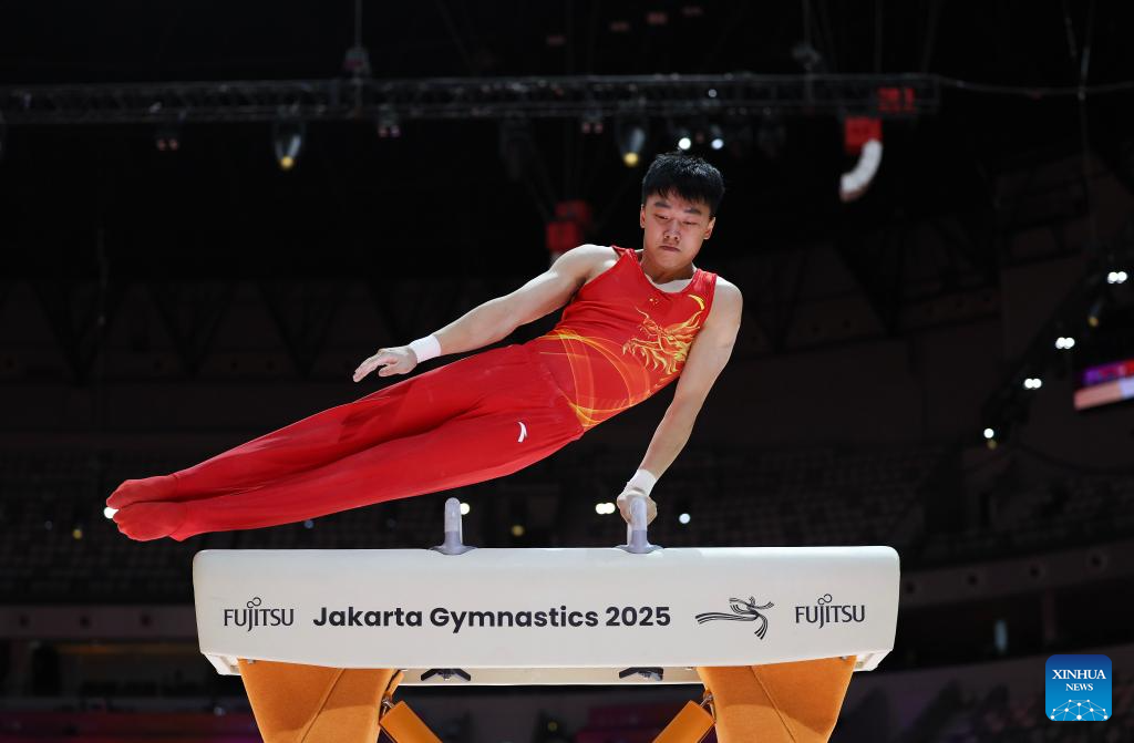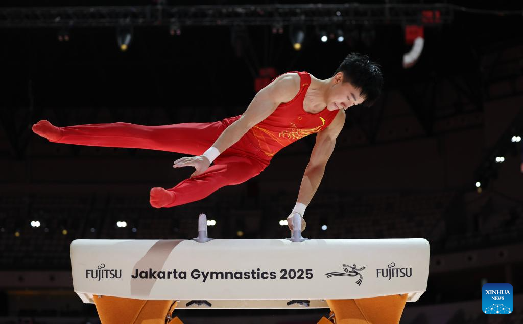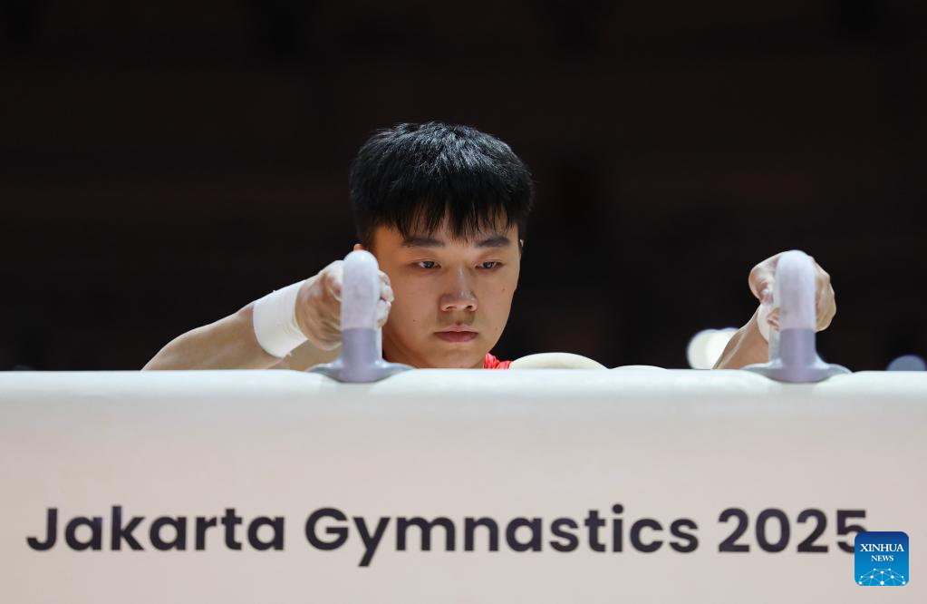Hong Yanming of China competes during the Men's Pommel Horse Final at 53rd FIG Artistic Gymnastics World Championships in Jakarta, Indonesia, on Oct. 24, 2025. (Xinhua/Bai Xuefei)