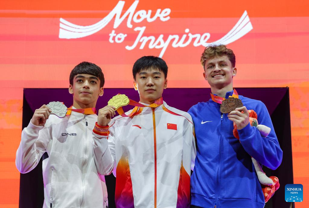 Gold medalist Hong Yanming (C) of China, silver medalist Mamikon Khachatryan (L) of Armenia and bronze medalist Patrick Hoopes of the United States pose during the awarding ceremony for the Men's Pommel Horse Final at 53rd FIG Artistic Gymnastics World Championships in Jakarta, Indonesia, on Oct. 24, 2025. (Xinhua/Bai Xuefei)
