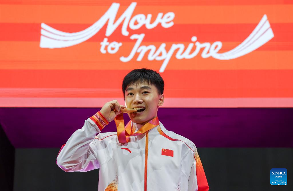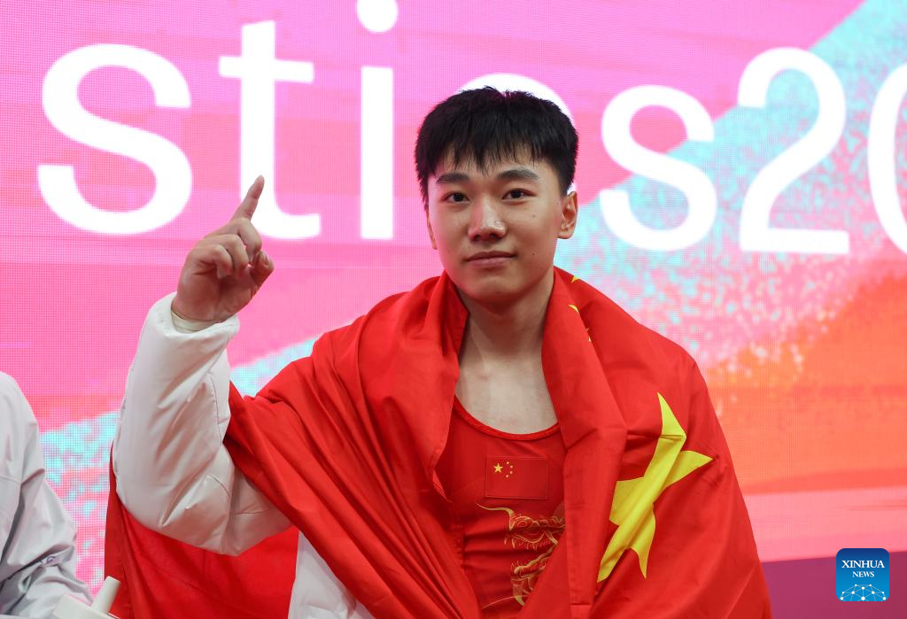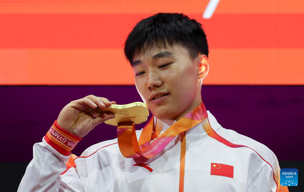 Hong Yanming of China celebrates during the awarding ceremony for the Men's Pommel Horse Final at 53rd FIG Artistic Gymnastics World Championships in Jakarta, Indonesia, on Oct. 24, 2025. (Xinhua/Bai Xuefei)