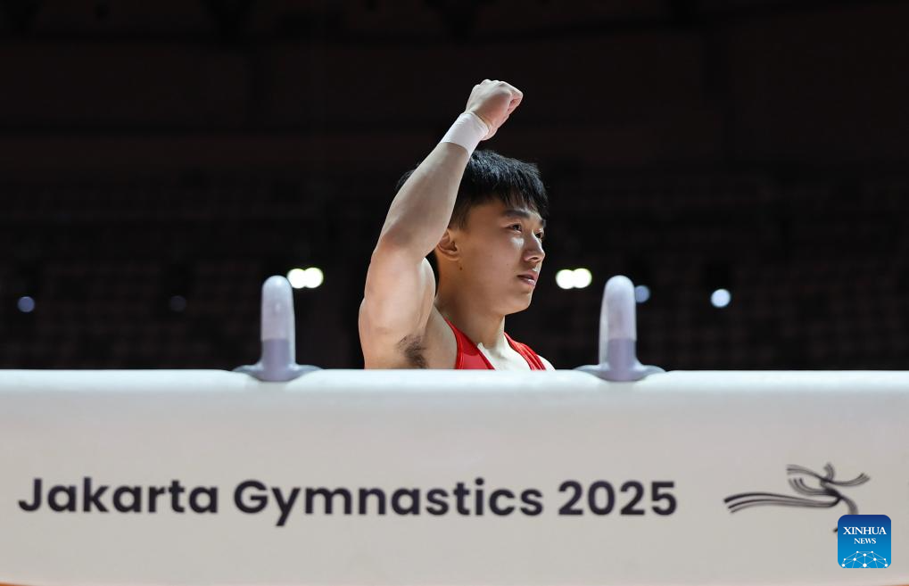 Hong Yanming of China celebrates after the Men's Pommel Horse Final at 53rd FIG Artistic Gymnastics World Championships in Jakarta, Indonesia, on Oct. 24, 2025. (Xinhua/Bai Xuefei)
