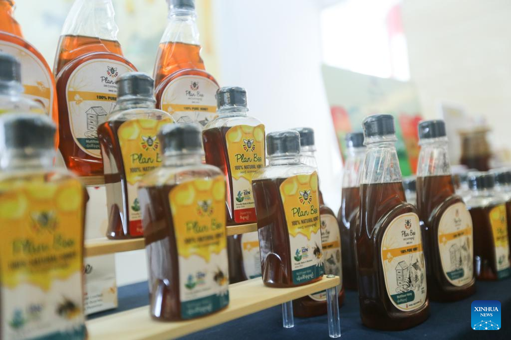 Honey products of Plan Bee Social Enterprise are shown during an exhibition in Yangon, Myanmar, Oct. 24, 2025. (Xinhua/Myo Kyaw Soe)