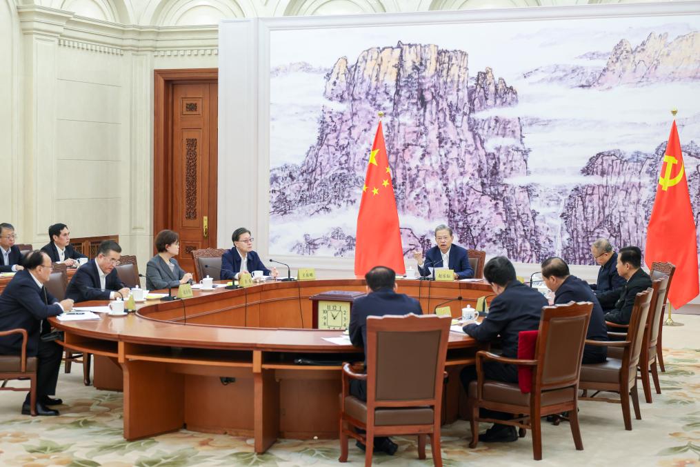 Zhao Leji, a member of the Standing Committee of the Political Bureau of the Communist Party of China (CPC) Central Committee, chairman of the National People's Congress (NPC) Standing Committee and secretary of its leading Party members' group, presides over a meeting of the group to study the guiding principles from the just-concluded fourth plenary session of the 20th CPC Central Committee in Beijing, capital of China, Oct. 24, 2025. (Xinhua/Liu Bin)