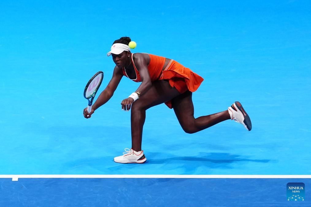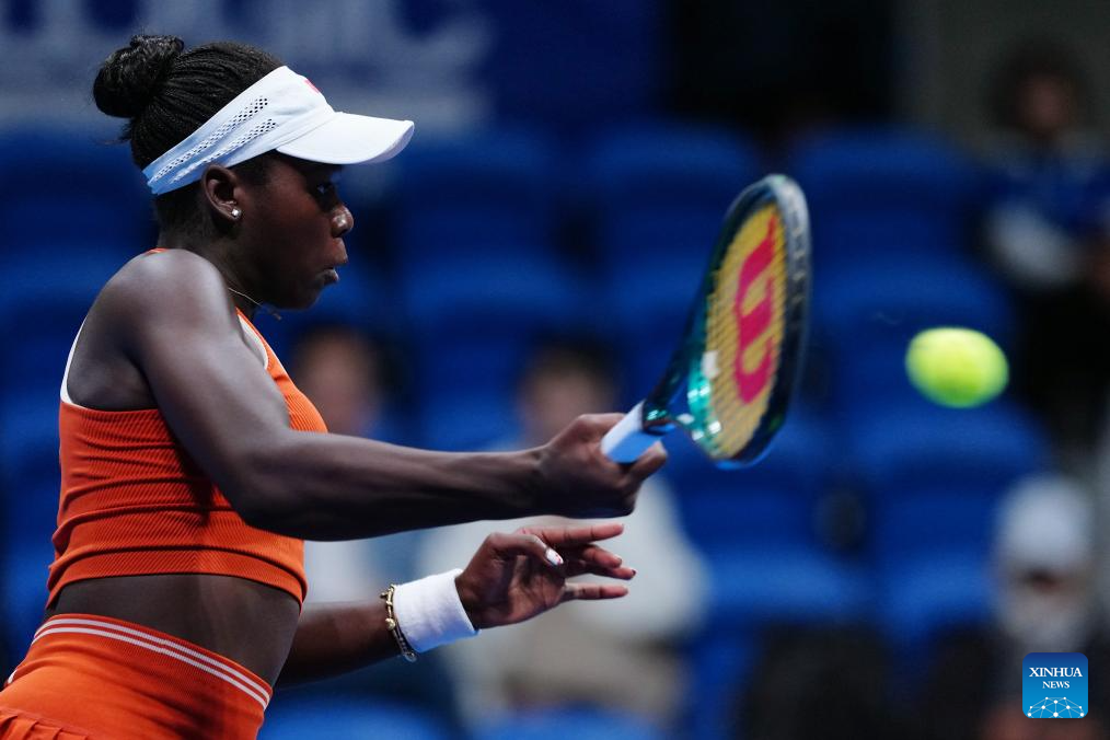 Victoria Mboko of Canada hits a return during the women's singles quarterfinal match between Elena Rybakina of Kazakhstan and Victoria Mboko of Canada at the Pan Pacific Open tennis tournament in Tokyo on Oct. 24, 2025. (Xinhua/Jia Haocheng)