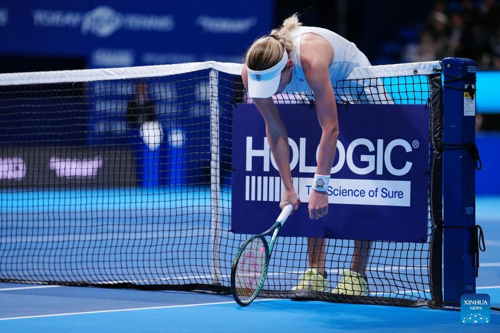 Ekaterina Alexandrova reacts during the women's singles quarterfinal match between Sofia Kenin of the United States and Ekaterina Alexandrova of Russia at the Pan Pacific Open tennis tournament in Tokyo, Japan, on Oct. 24, 2025. (Xinhua/Jia Haocheng)