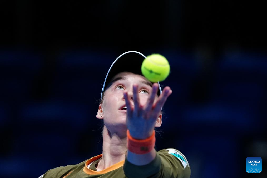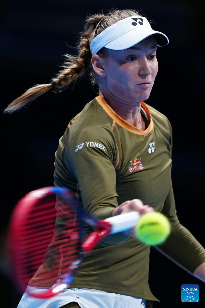 Elena Rybakina of Kazakhstan hits a return during the women's singles quarterfinal match between Elena Rybakina of Kazakhstan and Victoria Mboko of Canada at the Pan Pacific Open tennis tournament in Tokyo on Oct. 24, 2025. (Xinhua/Jia Haocheng)