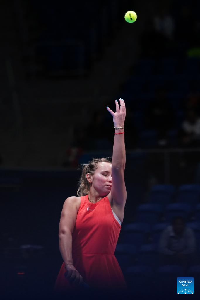 Ekaterina Alexandrova serves during the women's singles quarterfinal match between Sofia Kenin of the United States and Ekaterina Alexandrova of Russia at the Pan Pacific Open tennis tournament in Tokyo, Japan, on Oct. 24, 2025. (Xinhua/Jia Haocheng)