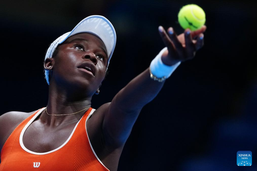 Victoria Mboko of Canada serves during the women's singles quarterfinal match between Elena Rybakina of Kazakhstan and Victoria Mboko of Canada at the Pan Pacific Open tennis tournament in Tokyo on Oct. 24, 2025. (Xinhua/Jia Haocheng)