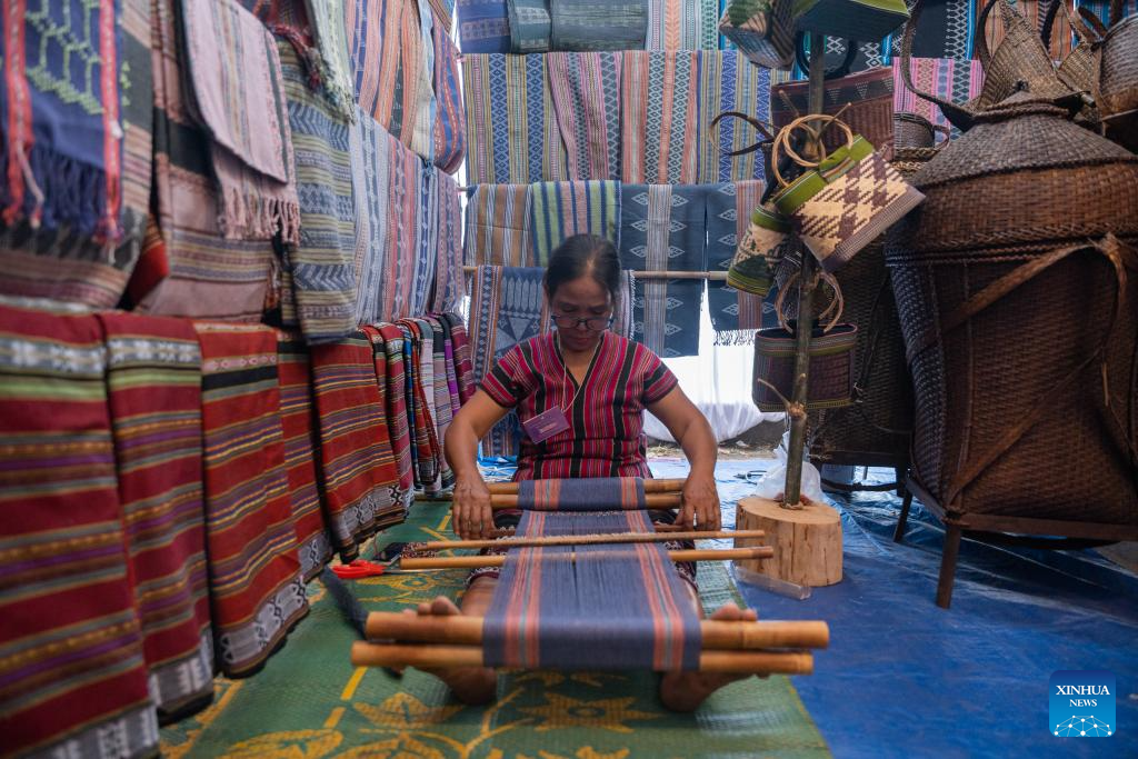 A craftsman works on a textile during the 24th Lao Handicraft Festival in Vientiane, Laos, Oct. 23, 2025. The festival is held here from Oct. 22 to 26. More than 130 exhibition booths have been set up, displaying textiles, jewellery, pottery, wood carvings, etc. In addition, visitors can enjoy a wide range of interactive cultural experiences during the festival. (Photo by Kaikeo Saiyasane/Xinhua)