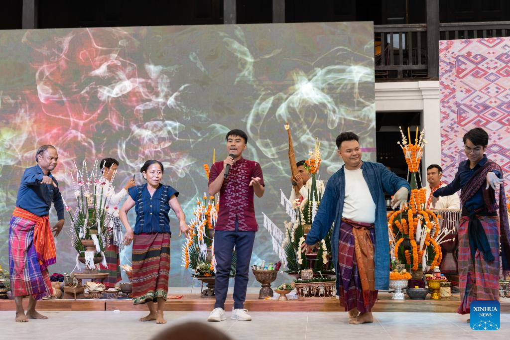 A performance is staged during the 24th Lao Handicraft Festival in Vientiane, Laos, Oct. 23, 2025. The festival is held here from Oct. 22 to 26. More than 130 exhibition booths have been set up, displaying textiles, jewellery, pottery, wood carvings, etc. In addition, visitors can enjoy a wide range of interactive cultural experiences during the festival. (Photo by Kaikeo Saiyasane/Xinhua)