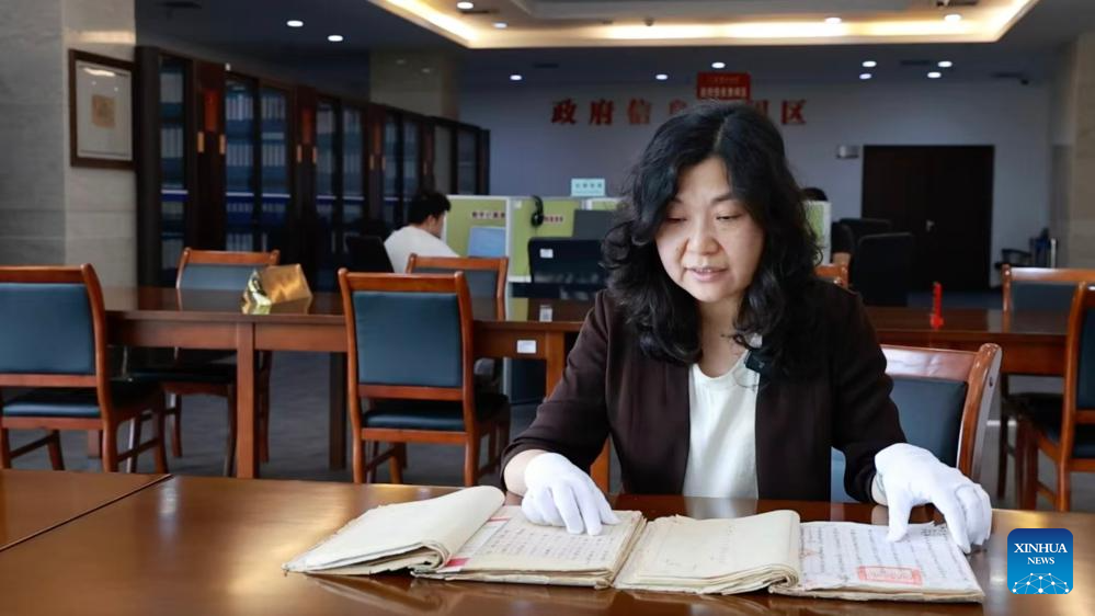 Chen Feng, an official at the Fujian Provincial Archives, reads through archival documents on the Taiwan volunteer corps in Fuzhou, southeast China's Fujian Province, on Aug. 26, 2025. (Xinhua/Chen Wang)