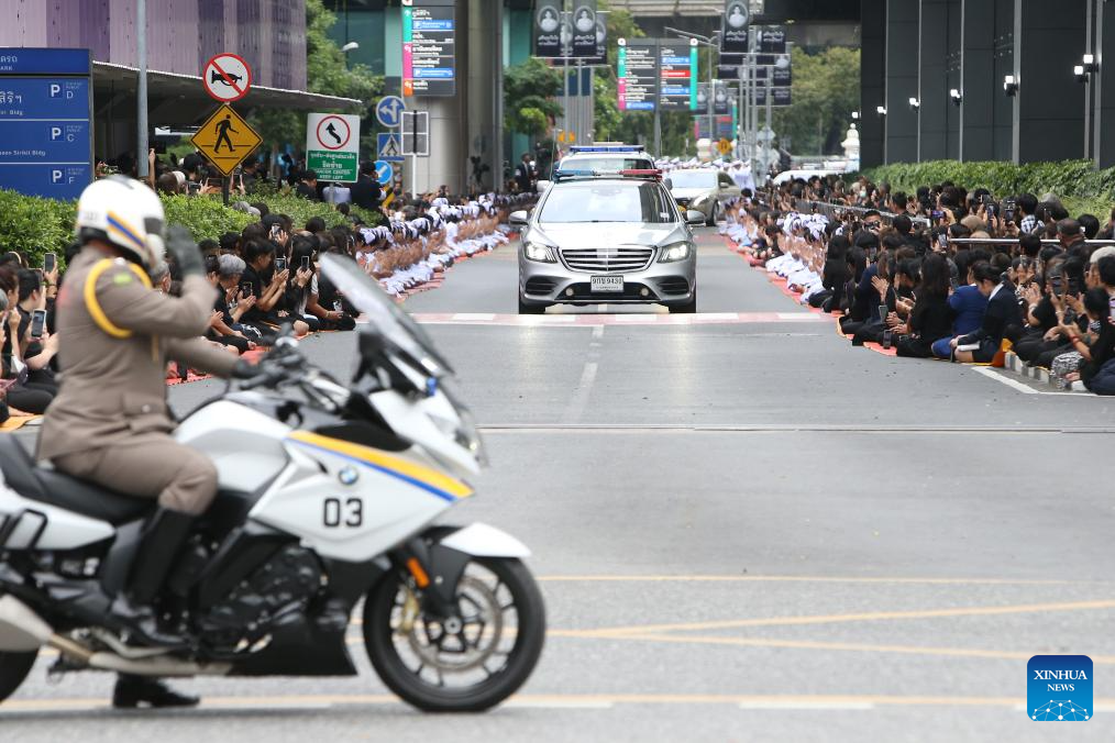 The hearse carrying the late Thailand's Queen Mother Sirikit passes by mourners at King Chulalongkorn Memorial Hospital in Bangkok, Thailand, Oct. 26, 2025. Thailand's Queen Mother Sirikit passed away on Friday at the age of 93, the Bureau of the Royal Household announced. (Xinhua/Rachen Sageamsak)