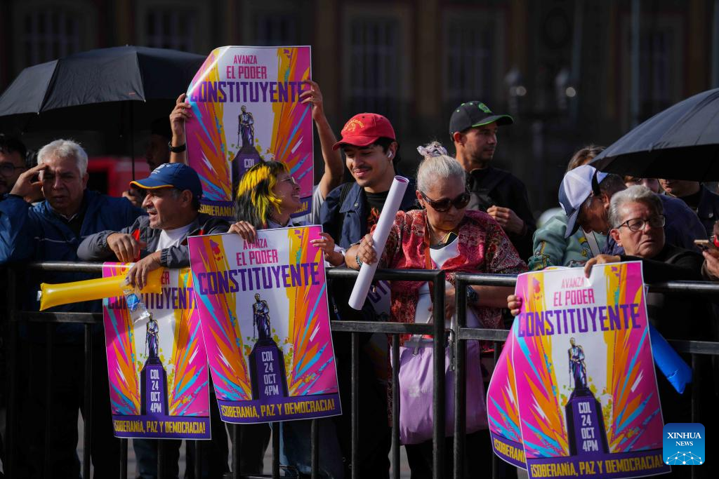 People attend a rally supporting Colombian President Gustavo Petro at the Plaza de Bolivar in Bogota, capital of Colombia, Oct. 24, 2025. The Trump administration on Friday imposed sanctions on Colombian President Gustavo Petro amid deteriorating bilateral relations, accusing Petro of allowing drug cartels to "flourish," according to a statement from the U.S. Department of the Treasury. (Photo by Andres Moreno/Xinhua)