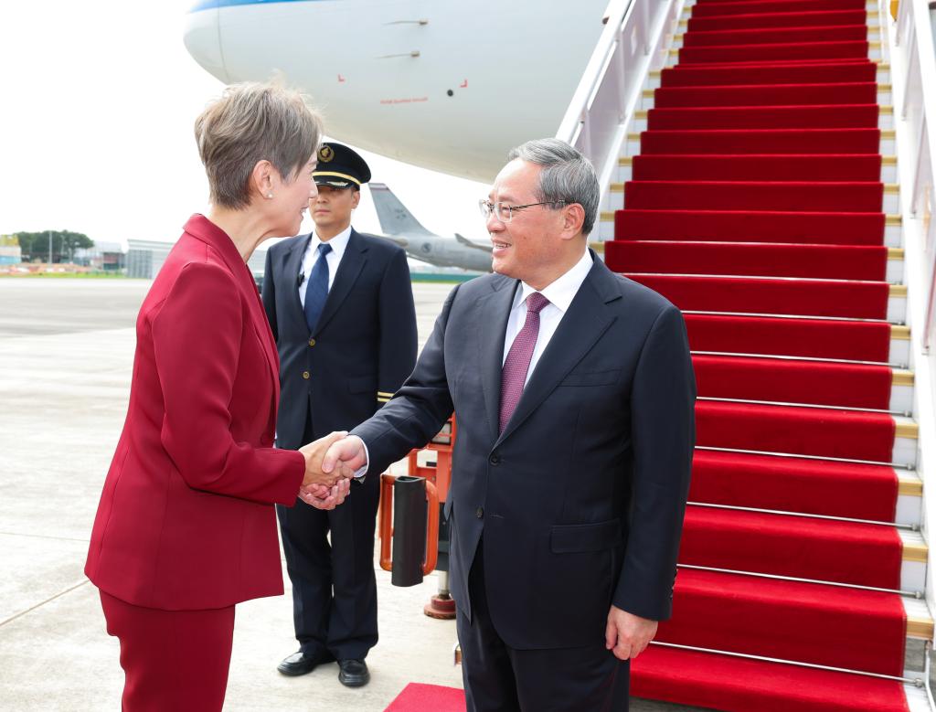 Chinese Premier Li Qiang arrives at Singapore's Changi airport in Singapore, Oct. 25, 2025. Li arrived here Saturday for an official visit to Singapore at the invitation of Singaporean Prime Minister Lawrence Wong. Josephine Teo, Singaporean Minister for Digital Development and Information, and Cao Zhongming, Chinese Ambassador to Singapore, greeted Li at the airport. (Xinhua/Huang Jingwen)