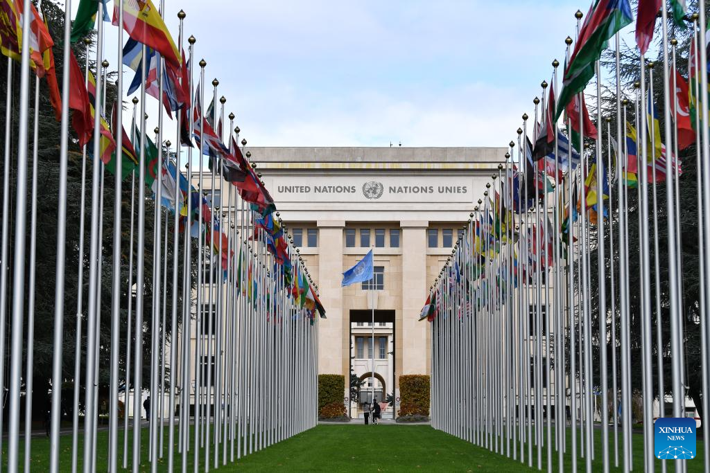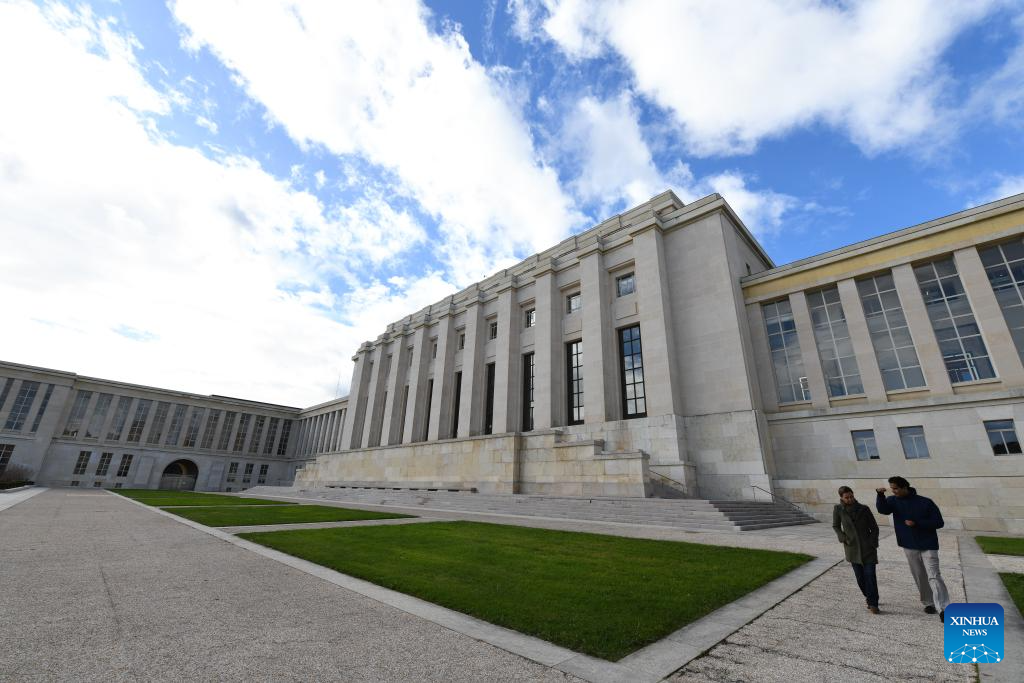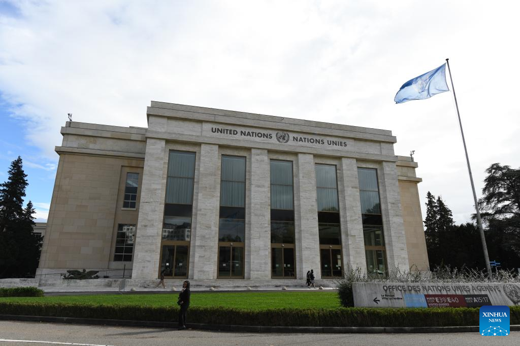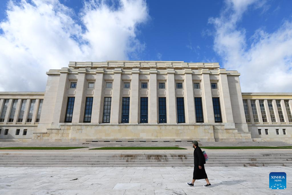 The Palais des Nations is pictured in Geneva, Switzerland, Oct. 24, 2025. A photo exhibition titled "Shared Lives, Shared Future" commemorating the 80th anniversary of the United Nations was opened here at the Palais des Nations on Friday, which coincided with United Nations Day. The exhibition presented 27 stories showing the United Nations made a difference in people's daily lives, from advancing peace and security to providing humanitarian aid. (Xinhua/Lian Yi)