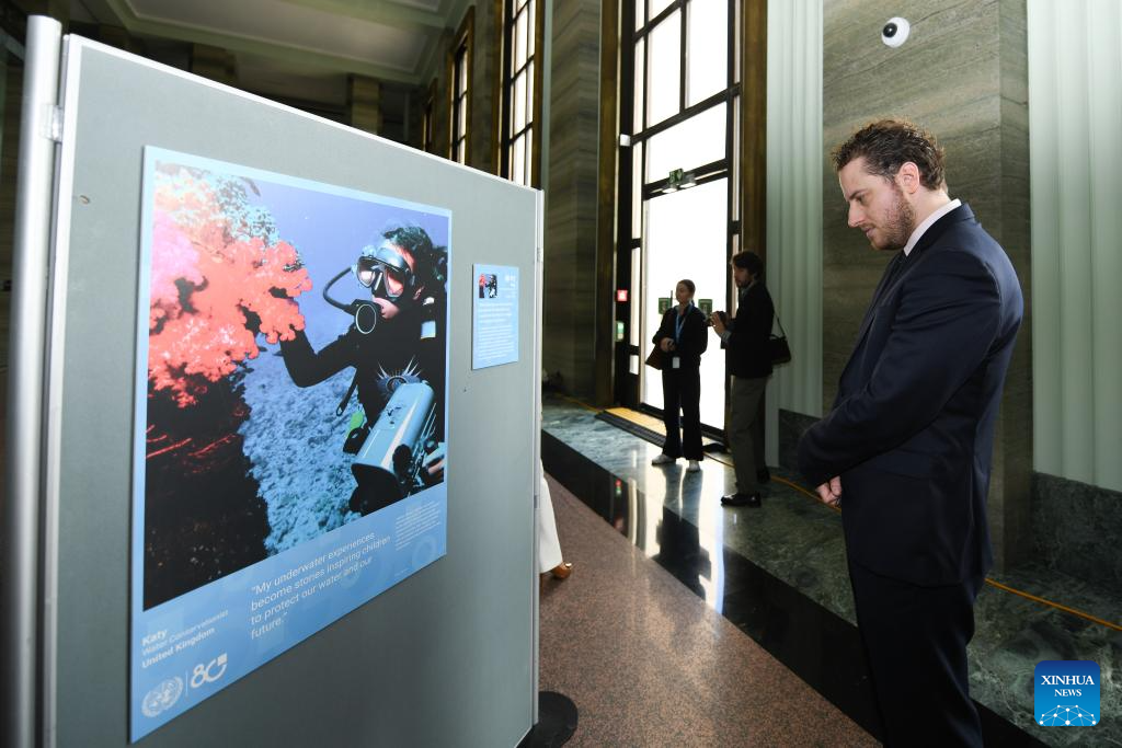 People visit the photo exhibition "Shared Lives, Shared Future" at the Palais des Nations in Geneva, Switzerland, Oct. 24, 2025. A photo exhibition titled "Shared Lives, Shared Future" commemorating the 80th anniversary of the United Nations was opened here at the Palais des Nations on Friday, which coincided with United Nations Day. The exhibition presented 27 stories showing the United Nations made a difference in people's daily lives, from advancing peace and security to providing humanitarian aid. (Xinhua/Lian Yi)