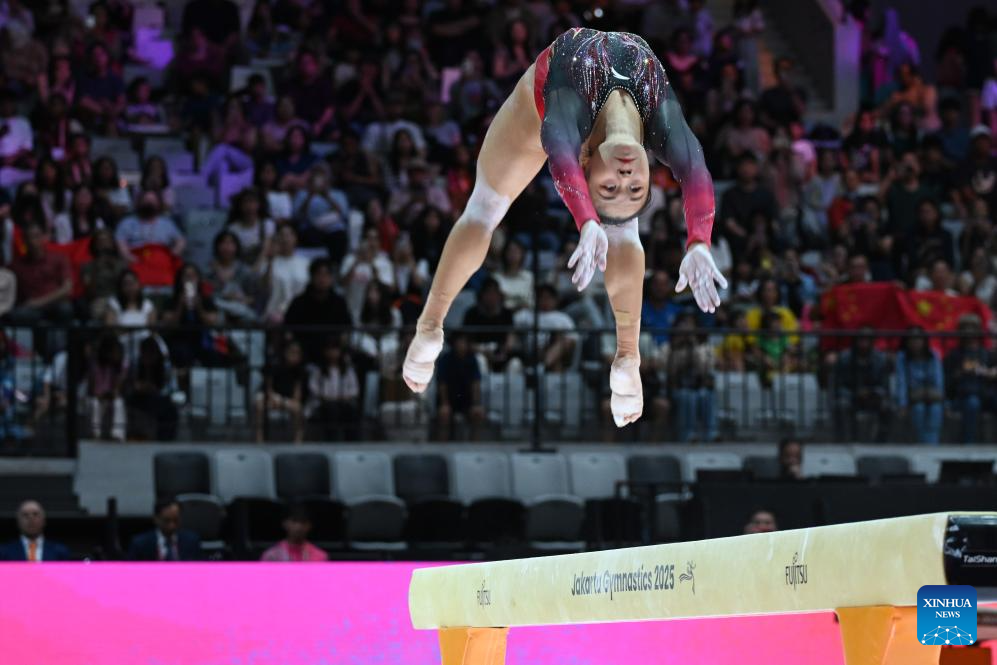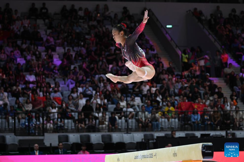 Zhang Qingying of China competes during the women's Balance Beam Final at 53rd FIG Artistic Gymnastics World Championships in Jakarta, Indonesia, on Oct. 25, 2025. (Xinhua/Agung Kuncahya B.)