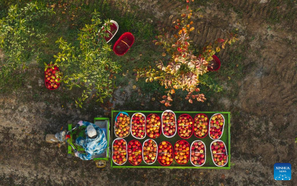 (251025) -- BEIJING, Oct. 25, 2025 (Xinhua) -- An aerial drone photo taken on Oct. 23, 2025 shows a staff member transporting newly-picked apples at an orchard in Alaer City, northwest China's Xinjiang Uygur Autonomous Region. Xinjiang's abundant sunshine and significant day-night temperature variations create ideal conditions for growing fruits with naturally high sugar content. The apple produced here with thin skin and dense and juicy flesh has become a signature specialty of Alaer. (Xinhua/Cai Yang)