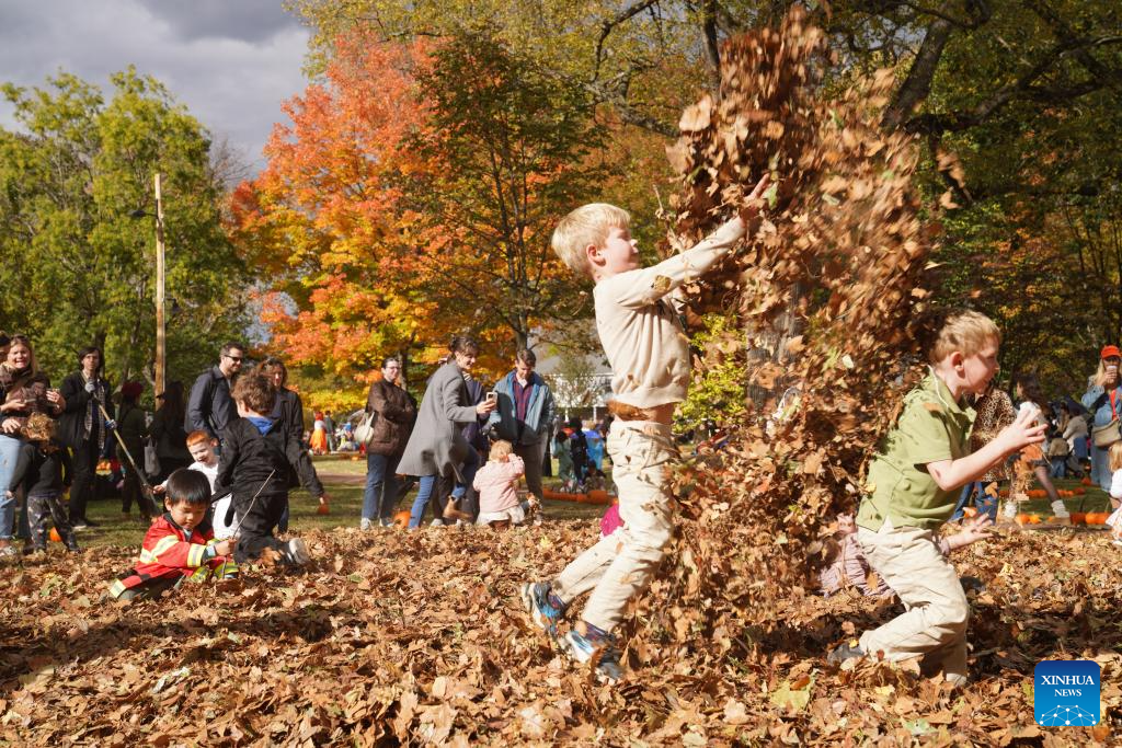 Children play among fallen leaves during a fall festival at the Governors Island in New York, the United States, on Oct. 25, 2025.
