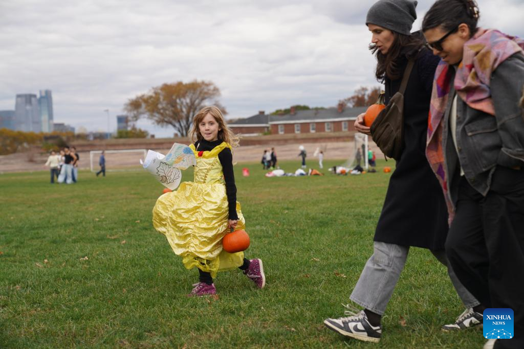 A girl holding a pumpkin walks on a lawn at the Governors Island in New York, the United States, on Oct. 25, 2025.