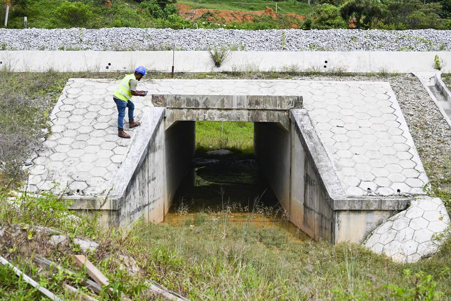 An environmental officer, who is responsible for daily inspections of animal passages and tracking the movements of wildlife such as tapirs and wild boars, is photographed at the East Coast Rail Link (ECRL) project in Pahang state, Malaysia, Oct. 10, 2025. An environmental officer tracks the movements of wildlife at an animal passage of the East Coast Rail Link (ECRL) project in Pahang state, Malaysia, Oct. 10, 2025.A monkey passes an underpass of the East Coast Rail Link (ECRL) project in Pahang state, Malaysia, Oct. 10, 2025.A drone photo taken on Oct. 10, 2025 shows noise barriers designed to reduce the noise pollution of the East Coast Rail Link (ECRL) project in Pahang state, Malaysia.An environmental officer and a security officer patrol at the East Coast Rail Link (ECRL) project in Pahang state, Malaysia, Oct. 10, 2025.A bird is pictured near the East Coast Rail Link (ECRL) project in Pahang state, Malaysia, Oct. 10, 2025.An aerial drone photo taken on Oct. 10, 2025 shows a view of a grand bridge of the East Coast Rail Link (ECRL) project in Pahang state, Malaysia.An aerial drone photo taken on Oct. 10, 2025 shows a ship sailing past a grand bridge of the East Coast Rail Link (ECRL) project in Pahang state, Malaysia.
