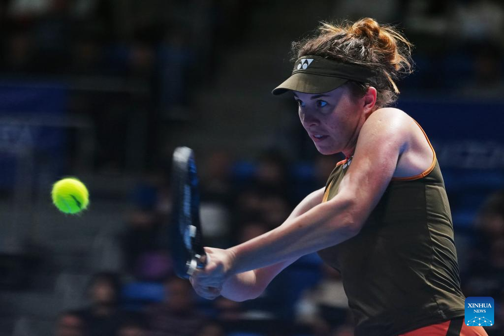 Linda Noskova of the Czech Republic hits a return during the women's singles final match between Belinda Bencic of Switzerland and Linda Noskova of the Czech Republic at the Pan Pacific Open tennis tournament in Tokyo, Japan, on Oct. 26, 2025. (Xinhua/Jia Haocheng)
