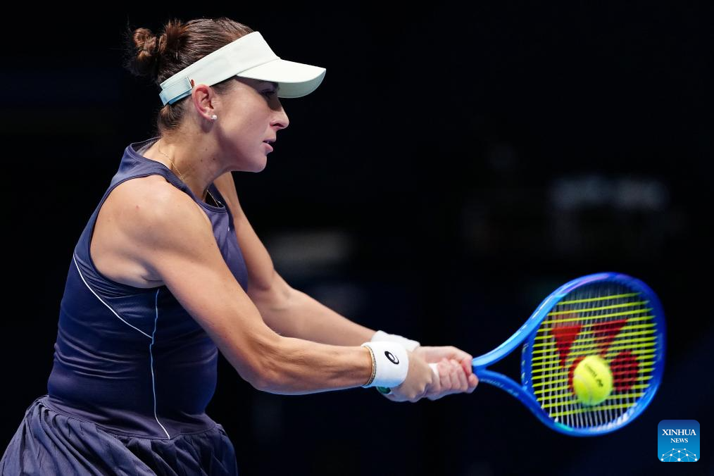 Belinda Bencic of Switzerland hits a return during the women's singles final match between Belinda Bencic of Switzerland and Linda Noskova of the Czech Republic at the Pan Pacific Open tennis tournament in Tokyo, Japan, on Oct. 26, 2025. (Xinhua/Jia Haocheng)