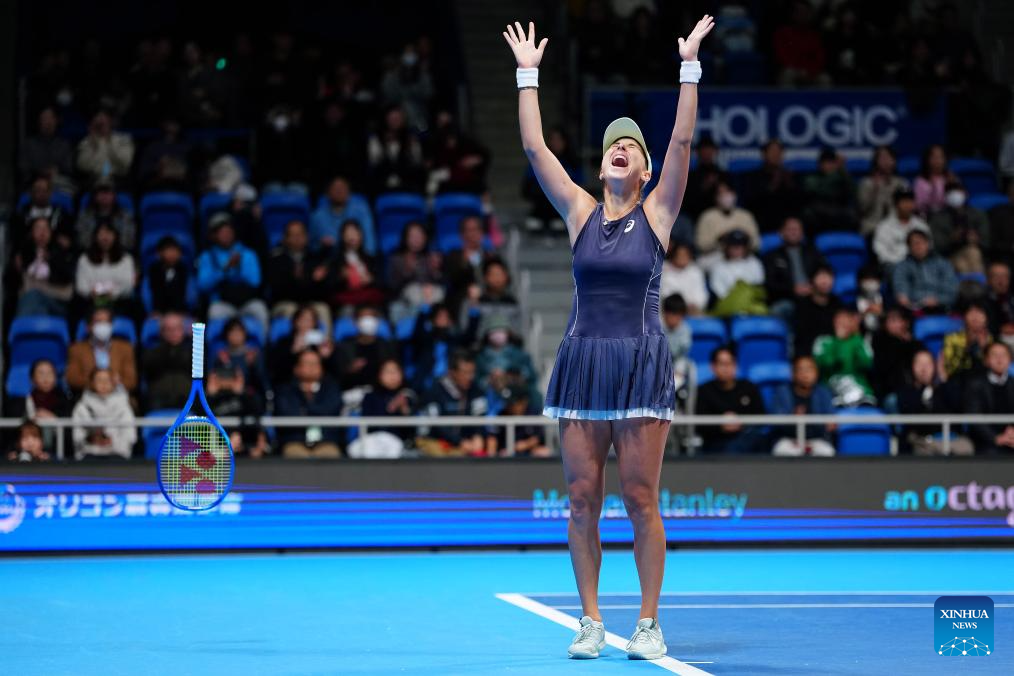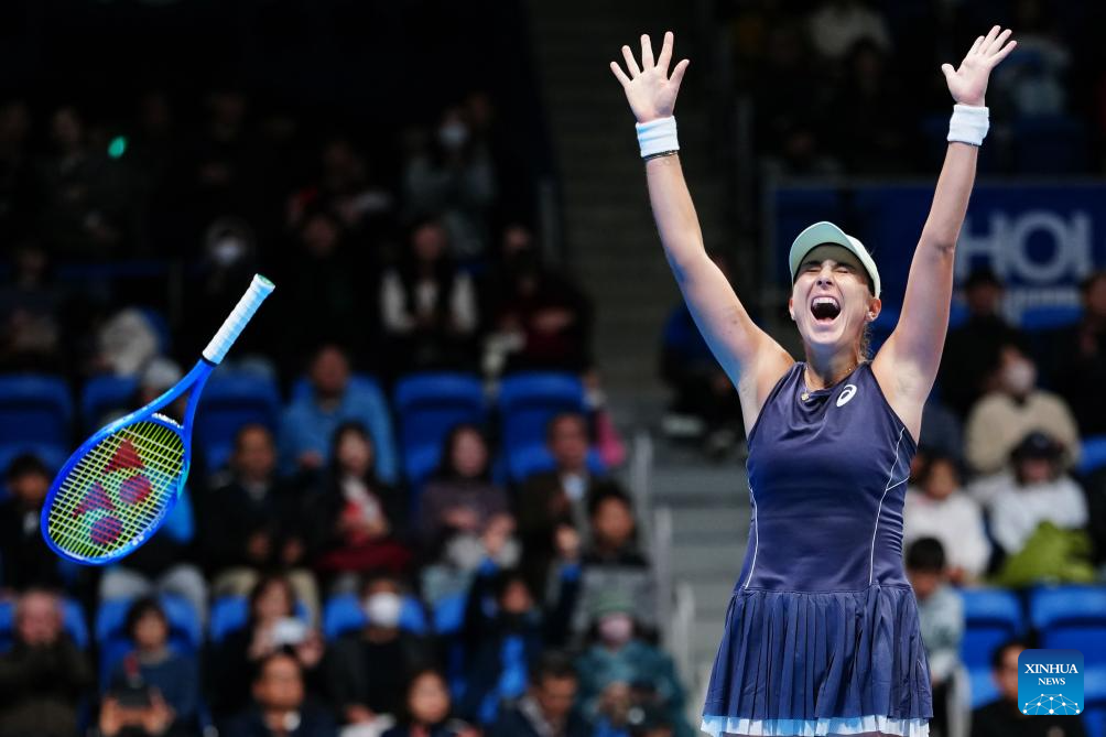 Belinda Bencic of Switzerland celebrates victory after winning the women's singles final match between Belinda Bencic of Switzerland and Linda Noskova of the Czech Republic at the Pan Pacific Open tennis tournament in Tokyo, Japan, on Oct. 26, 2025. (Xinhua/Jia Haocheng)