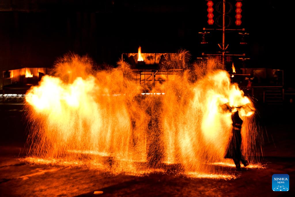 This photo taken on Oct. 23, 2025 show a performance of Huohu (fire pot) in Xinzhou ancient city in Xinzhou, north China's Shanxi Province. Leisure tourism in Xinzhou ancient city remains booming in late autumn. Tourism activities such as bathing in hot springs, taking photos in ancient costumes, and watching intangible cultural heritage performances have attracted many tourists to visit the ancient city for a few days, to deeply immerse themselves in the unique charm of traditional culture. (Xinhua/Cao Yang)