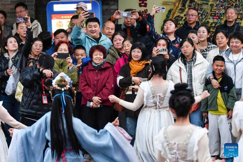Tourists watch a performance in Xinzhou ancient city in Xinzhou, north China's Shanxi Province, on Oct. 23 2025. Leisure tourism in Xinzhou ancient city remains booming in late autumn. Tourism activities such as bathing in hot springs, taking photos in ancient costumes, and watching intangible cultural heritage performances have attracted many tourists to visit the ancient city for a few days, to deeply immerse themselves in the unique charm of traditional culture. (Xinhua/Cao Yang)