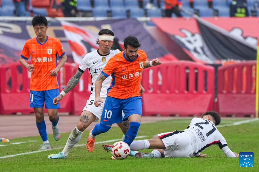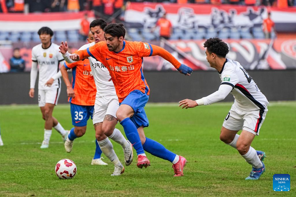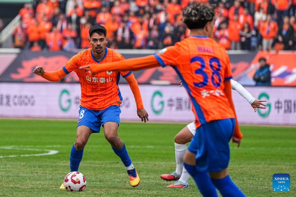 Zeca (2nd R) of Shandong Taishan competes during the 28th round match between Shandong Taishan and Shanghai Port at the 2025 Chinese Super League (CSL) in Jinan, east China's Shandong Province, Oct. 26, 2025. (Xinhua/Zhu Zheng)