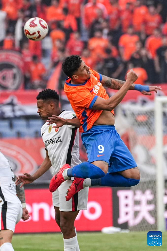 Cryzan Barcelos (R) of Shandong Taishan vies for a header during the 28th round match between Shandong Taishan and Shanghai Port at the 2025 Chinese Super League (CSL) in Jinan, east China's Shandong Province, Oct. 26, 2025. (Xinhua/Zhu Zheng)