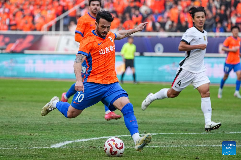 Valeri Qazaishvili (front) of Shandong Taishan shoots during the 28th round match between Shandong Taishan and Shanghai Port at the 2025 Chinese Super League (CSL) in Jinan, east China's Shandong Province, Oct. 26, 2025. (Xinhua/Zhu Zheng)