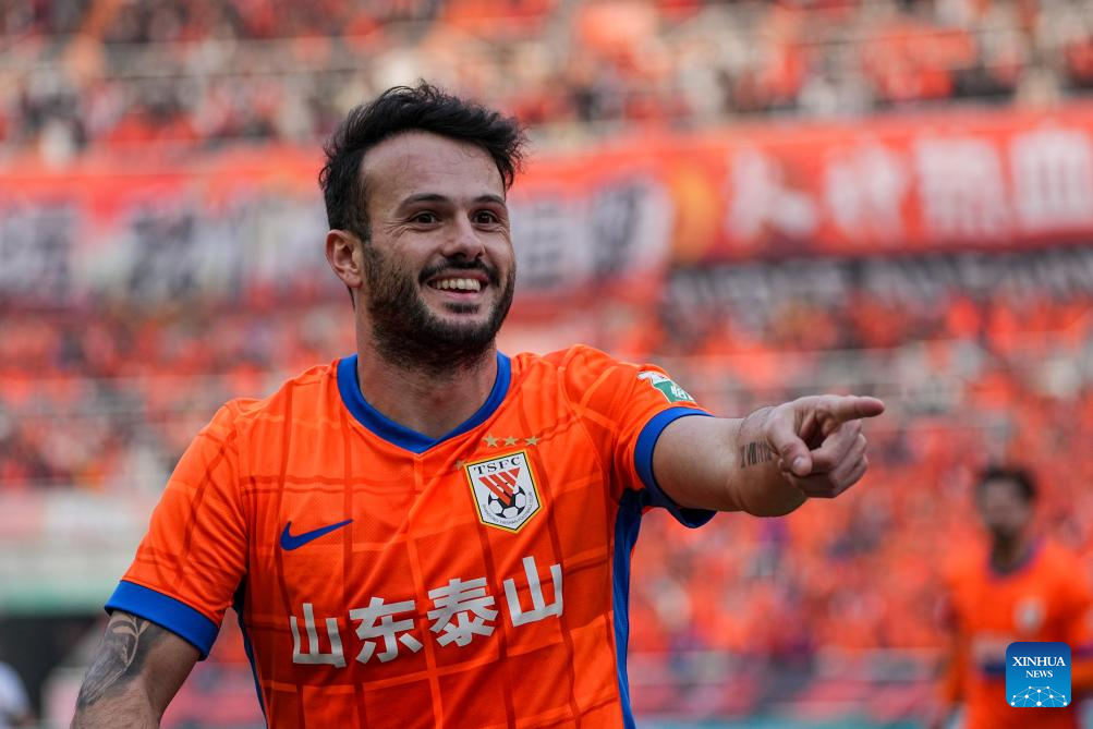 Valeri Qazaishvili of Shandong Taishan celebrates his goal during the 28th round match between Shandong Taishan and Shanghai Port at the 2025 Chinese Super League (CSL) in Jinan, east China's Shandong Province, Oct. 26, 2025. (Xinhua/Zhu Zheng)