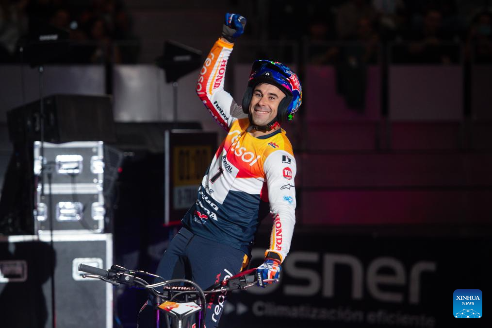 Toni Bou of Spain celebrates during the 2025-2026 FIM X-Trial World Championship, at Madrid Arena Stadium, Madrid, Spain, on Oct 25, 2025. (Photo by Gustavo Valiente/Xinhua)