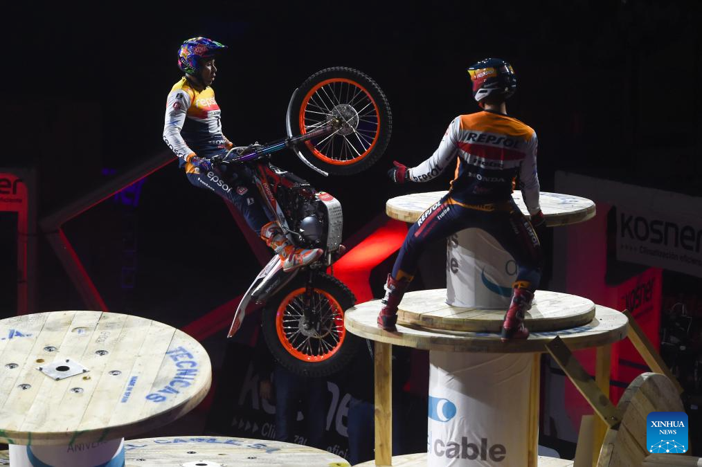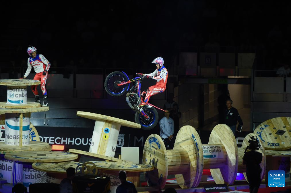 Jaime Busto (L) of Spain competes during the 2025-2026 FIM X-Trial World Championship, at Madrid Arena Stadium, Madrid, Spain, on Oct 25, 2025. (Photo by Gustavo Valiente/Xinhua)
