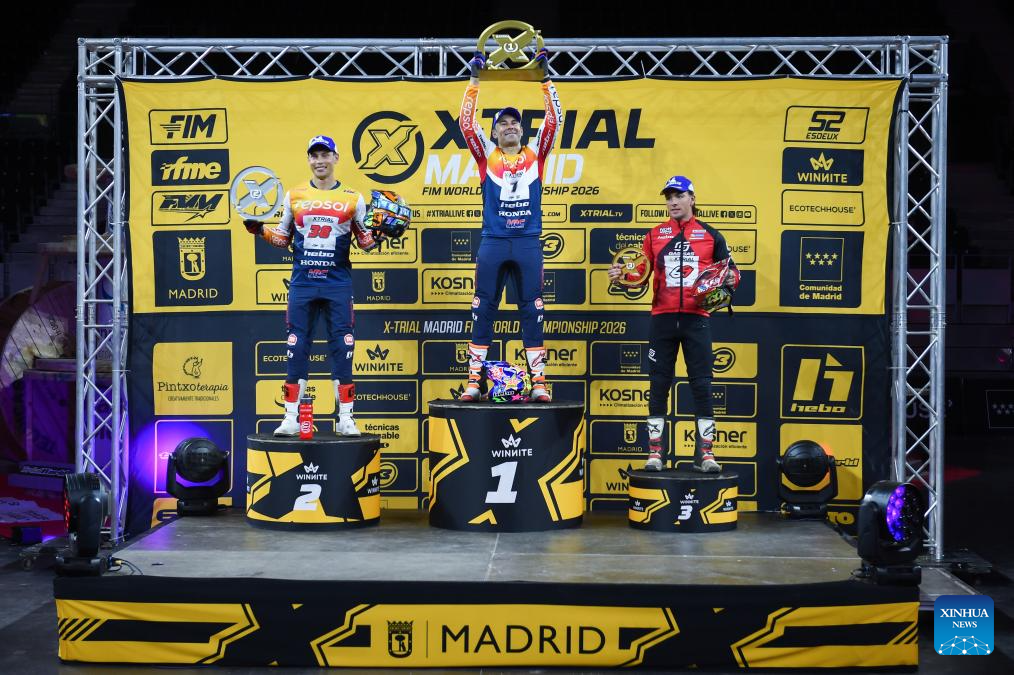 First-placed Toni Bou(C) of Spain, second-placed Gabriel Marcelli(L) of Spain and third-placed Jaime Busto of Spain pose for photo during the awarding ceremony for the 2025-2026 FIM X-Trial World Championship, at Madrid Arena Stadium, Madrid, Spain, on Oct 25, 2025. (Photo by Gustavo Valiente/Xinhua)
