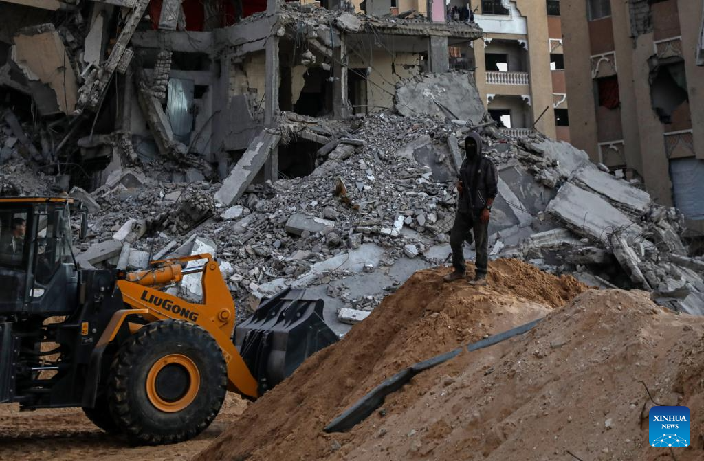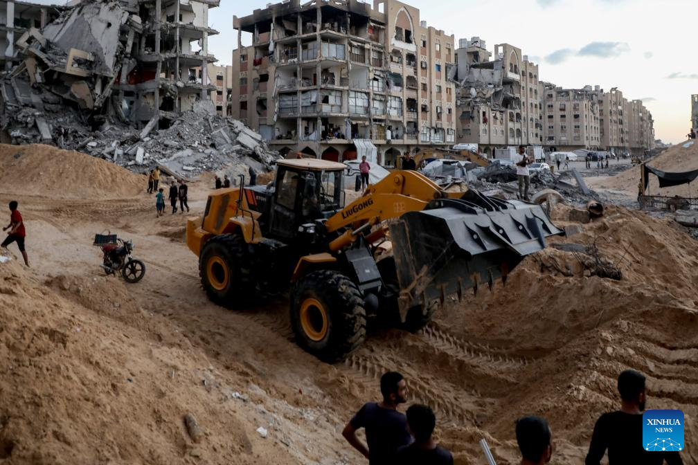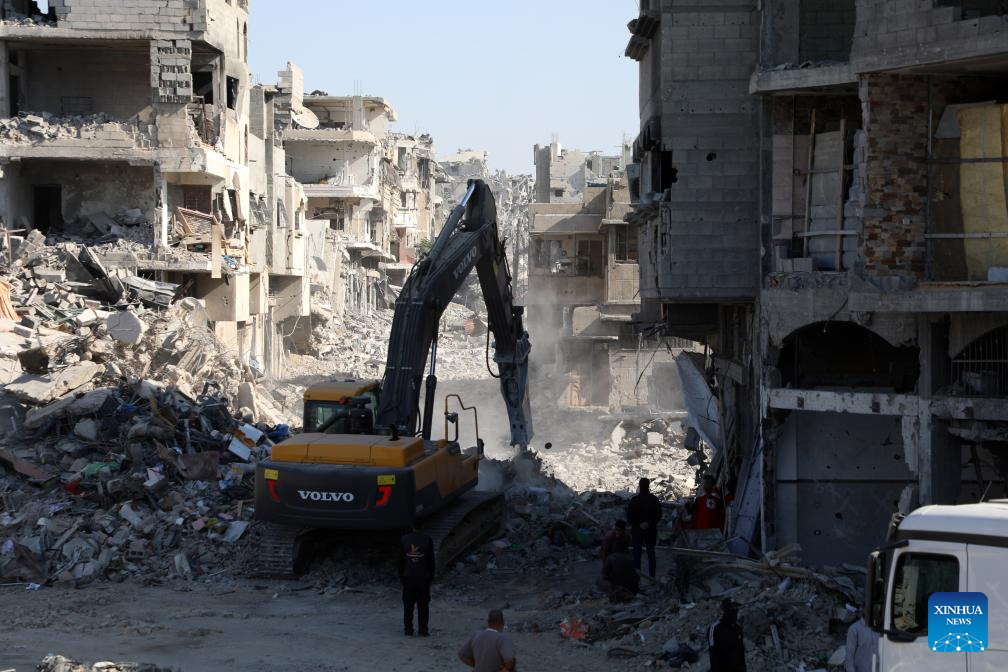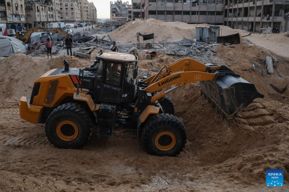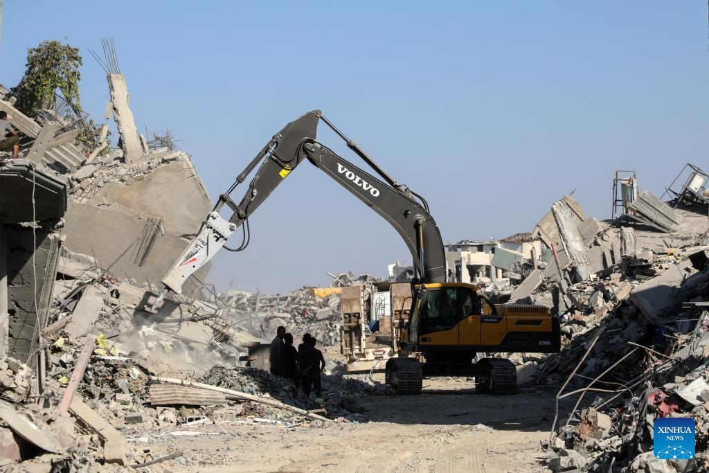 An Egyptian Excavator works at al-Tuffah area east of Gaza City, Oct. 27, 2025. Red Cross and Egyptian teams have been allowed to enter the Gaza Strip to search for the bodies of hostages, Israeli government spokesperson Shosh Bedrosian said on Sunday. (Photo by Rizek Abdeljawad/Xinhua)