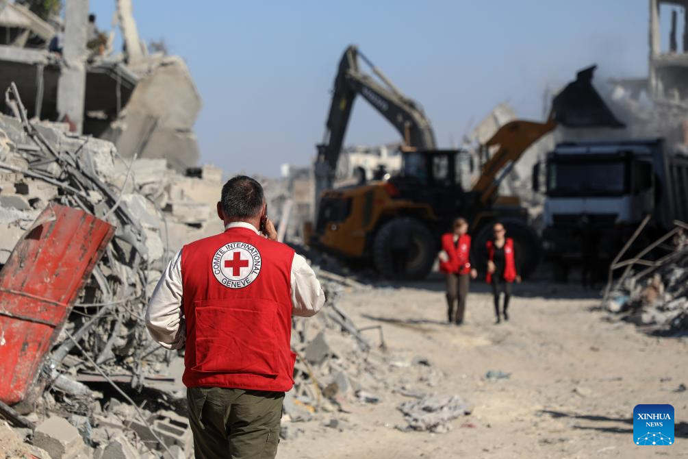 A Red Cross member is seen as an Egyptian Excavator is working at al-Tuffah area east of Gaza City, Oct. 27, 2025. Red Cross and Egyptian teams have been allowed to enter the Gaza Strip to search for the bodies of hostages, Israeli government spokesperson Shosh Bedrosian said on Sunday. (Photo by Rizek Abdeljawad/Xinhua)