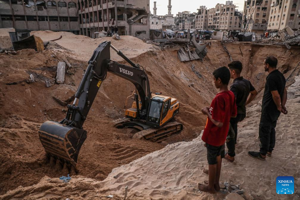 An Egyptian Excavator digs during searching for Israeli remains in the southern Gaza Strip city of Khan Younis, Oct. 26, 2025. Egypt has dispatched a specialized team and equipment to Gaza to assist in recovering the bodies of Israeli hostages held in the enclave, Egypt's Al-Qahera News reported Saturday. (Photo by Rizek Abdeljawad/Xinhua)